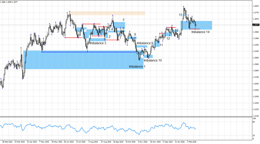 Пара GBP/USD заполнила последний «бычий» имбаланс на 100%, получила реакцию на его нижнюю границу, поднялась к верхней границе паттерна и на этом усилия быков закончились. К сожалению, очень неплохой торговый сигнал по тренду пока не оправдывает возложенные на него ожидания. Тем не менее, я бы не стал паниковать раньше времени. На имбаланс 14 может последовать двойная реакция. Хоть я и люблю подобные сигналы, нельзя отрицать их существование. Вчера был произведен съем ликвидности со свинга от 6 февраля, что также предупреждает о готовящейся атаке быков. Имбаланс 14 не инвалидирован, а тренд остается «бычьим».