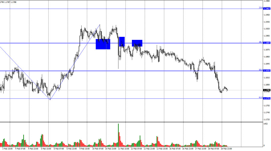 В течение последней отчетной недели профессиональные игроки открыли 16403 Long-контракта и закрыли 541 контракт Short. Настроение группы «Non-commercial» остается «бычьим» благодаря Дональду Трампу и его политике, и только усиливается с течением времени. Общее количество контрактов Long, сосредоточенных на руках спекулянтов, теперь составляет 319 тысяч, а контрактов Short – 138 тысяч. Это более, чем двукратное преимущество быков. Тридцать три недели подряд крупные игроки избавлялись от Short-позиций и наращивали Long. Затем начался «шатдаун», но сейчас мы наблюдаем ту же самую картину: профессиональные трейдеры продолжают наращивать Long-позиции. Политика Дональда Трампа остается наиболее весомым фактором для трейдеров, так как вызывает множество проблем, которые будут иметь долгосрочный и структурный характер для Америки. Например, серьезное ухудшение рынка труда(2025 год), снижение мировой репутации. Трейдеры опасаются также потери независимости ФРС в 2026 году и геополитических амбиций Дональда Трампа. Календарь новостей для США и Евросоюза: США – Изменение числа первичных заявок на пособия по безработице (13-30 UTC). 19 февраля календарь экономических событий содержит в себе одну запись, которую вряд ли можно назвать важной. Влияние информационного фона на настроение рынка в четверг может отсутствовать. Прогноз по EUR/USD и советы трейдерам: Продажи пары были возможны при закрытии на часовом графике под уровнем 1,1889 с целью 1,1830. Цель была отработана. Новые продажи были возможны при закрытии под уровнем 1,1830 с целью 1,1770. Эти сделки можно держать открытыми в четверг. Покупки станут возможными при отбое часовом графике от уровня 1,1770 с целью 1,1830. Сетки уровней Фибоначчи построены по 1,1805–1,1578 на часовом графике и по 1,1919–1,1471 на 4-часовом.Материал предоставлен компанией InstaForex - www.instaforex.com
