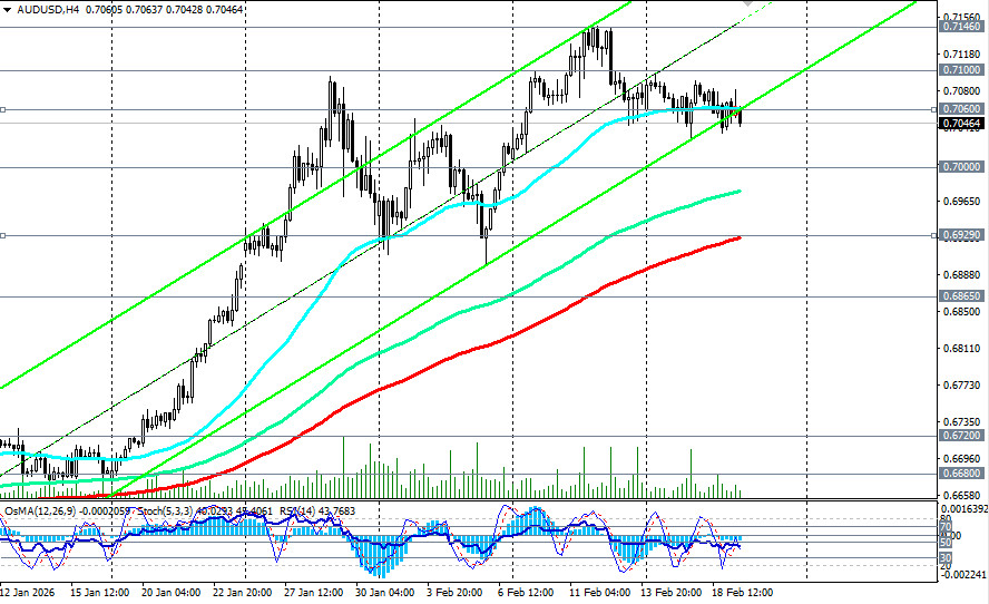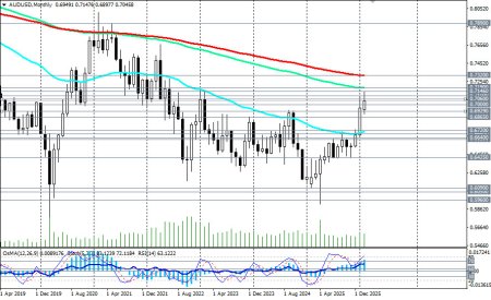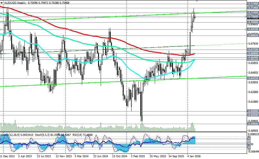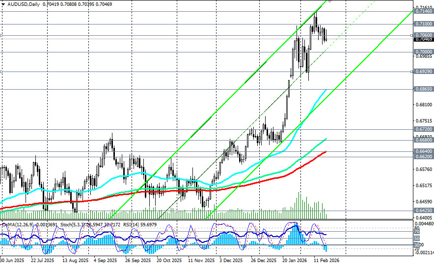 Текущая динамика AUD/USD определяется сочетанием внутренних факторов Австралии и внешней конъюнктуры на мировом финансовом рынке. Поддержка рынка труда и контроль над инфляцией являются ключевыми элементами стабильности валюты, однако глобальная политика центральных банков, включая решения ФРС, остаются определяющими факторами направления курса, отметили мы в нашем сегодняшнем фундаментальном анализе и обзоре «AUD/USD: ястребиный РБА и осторожный доллар». Пара продолжает торговаться выше восходящей ЕМА200 на 4-часовом графике, проходящей через отметку 0.6929. Удержание этого уровня критически важно для сохранения краткосрочного восходящего тренда. Пробой ниже может открыть путь к коррекции в зону 0.6900 – 0.6865 (ЕМА50 на дневном графике). Ближайший барьер для роста находится в районе 0.7080 - 0.7100. Преодоление отметки 0.7100 необходимо для тестирования годового максимума выше 0.7145 и последующего движения к 0.7200. Основной сценарий AUD/USD может продолжить рост в направлении 0.7100 – 0.7190 (ЕМА144 на месячном графике), сохраняя бычий уклон при коррекциях к поддержкам. Дальнейший рост и пробой стратегических уровней сопротивления 0.7300, 0.7320 (ЕМА200 на месячном графике) выведет цену в зону глобального бычьего рынка, открыв цене дорогу в сторону локальных уровней сопротивления 0.7900, 0.8000 (максимумы 2021 года), 0.8100 (максимумы 2018 года). Первым сигналом для начала реализации данного сценария может стать пробой уровня сопротивления 0.7060 (ЕМА200 на 1-часовом графике) и сегодняшнего максимума 0.7080. Самым ранним сигналом для реализации альтернативного сценария может стать пробой минимума недели и отметки 0.7028. Пробой «круглого» уровня 0.7000 может спровоцировать усиление коррекции в сторону зоны поддержки 0.6929 (ЕМА200 на 4-часовом графике) – 0.6900. Более глубокая коррекция подразумевает снижение к зоне поддержки вокруг уровней 0.6900, 0.6865 (EMA50 на дневном графике). Дальнейшее снижение и пробой ключевой поддержки на уровне 0.6680 (ЕМА200 на недельном графике) вернет цену в зону долгосрочного медвежьего рынка с целями снижения на ключевых уровнях поддержки 0.6640 (ЕМА200 на дневном графике), 0.6620 (ЕМА50 на недельном графике), 0.6600. Их пробой, в свою очередь, окончательно переломит бычий тренд, вернув AUD/USD также и в зону глобального медвежьего рынка. Уровни поддержки: 0.7000, 0.6926, 0.6900, 0.6865, 0.6800, 0.6720, 0.6700, 0.6697, 0.6680, 0.6640, 0.6620, 0.6600 Уровни сопротивления: 0.7060, 0.7100, 0.7146, 0.7190, 0.7200, 0.7300, 0.7320, 0.7890, 0.7900, 0.8000, 0.8100 Торговые сценарии