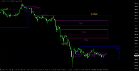 На 4-часовом таймфрейме цена также продолжает формирование нисходящей структуры. Линия CHOCH проходит на уровне 90 560$, только выше нее можно будет говорить о преобразовании тренда в восходящий. Однако на данный момент нет никаких признаков того, что биткоин может завершить падение в ближайшее время. Все последние паттерны FVG ее дали никакой ощутимой реакции. Мы считаем, что в данное время на 4-часовом ТФ сформировался флэт. Следовательно, торговые позиции можно рассматривать только в случае образования девиаций.Рекомендации по торговле BTC/USD:
