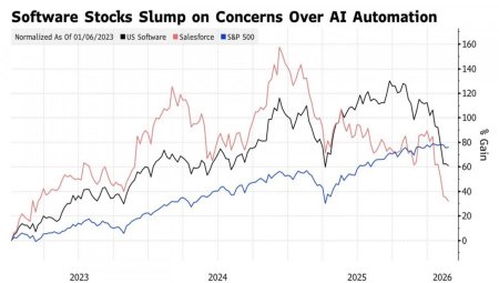 Рынок перешел черту. Он уже не может закрывать глаза на то, что происходит на Ближнем Востоке. Дональд Трамп дает Тегерану от 10 до 15 дней, чтобы заключить ядерную сделку. Президент думает над военными ударами по территории Ирана. Если они не помогут, США намерены провести мероприятия по смене власти в этой стране. Нефть растет как на дрожжах и может взлететь выше $100 за баррель в случае перекрытия Ормузского пролива. Рынки ставок Kalshi и Polymarket выдают 34% и 38% вероятность такого исхода до конца 2026 соответственно. Нефтяные кризисы наносят серьезные удары по мировой экономике, что ухудшает финансовые результаты компаний. Неудивительно, что S&P 500 наконец обратил внимание на риски геополитического характера. До этого широкий фондовый индекс находился в режиме концентрации внимания на один-единственный фактор – ротацию. На равновзвешенной основе он вырос на 6% с начала года, что доказывает намерение инвесторов сбросить с рук акции компаний технологического сектора. Особенной нелюбовью пользовались бумаги производителей программного обеспечения. Динамика S&P 500 и компаний-производителей ПО