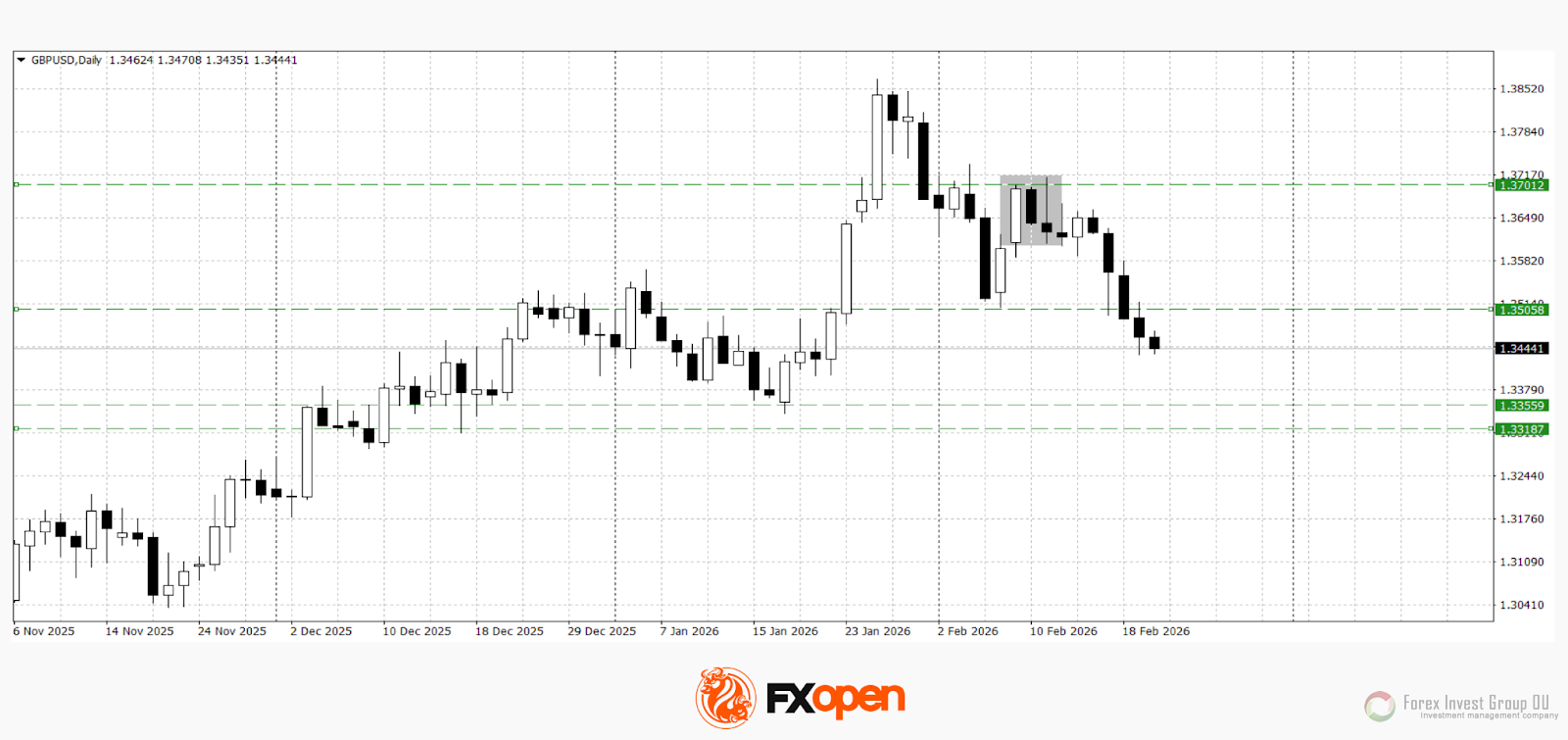 FxSignal 20-02-2026, 14:00 12 Аналитика, прогнозы валютного рынкаEUR/USD и GBP/USD продолжили снижение, обновив недавние экстремумы после восходящей коррекции, сформированной на прошлой неделе. Попытка восстановления носила технический характер и не изменила общей структуры движения. Дополнительное давление на европейские валюты оказало укрепление доллара после публикации в среду протоколов Федерального комитета по операциям на открытом рынке, которые продемонстрировали осторожный подход регулятора и отсутствие сигналов к скорому смягчению политики. Это усилило позиции американской валюты и стало катализатором нового нисходящего импульса по EUR/USD и GBP/USD.