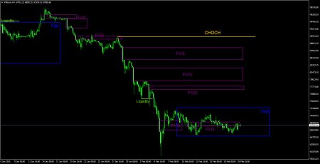 На 4-часовом таймфрейме цена также продолжает формирование нисходящей структуры. Линия CHOCH проходит на уровне 90 560$, только выше нее можно будет говорить о преобразовании тренда в восходящий. Однако на данный момент нет никаких признаков того, что биткоин может завершить падение в ближайшее время. Все последние паттерны FVG не дали никакой ощутимой реакции. Мы считаем, что в данное время на 4-часовом ТФ сформировался флэт. Следовательно, торговые позиции можно рассматривать только в случае образования девиаций, которых в последнее время тоже не было ни одной.Рекомендации по торговле BTC/USD: