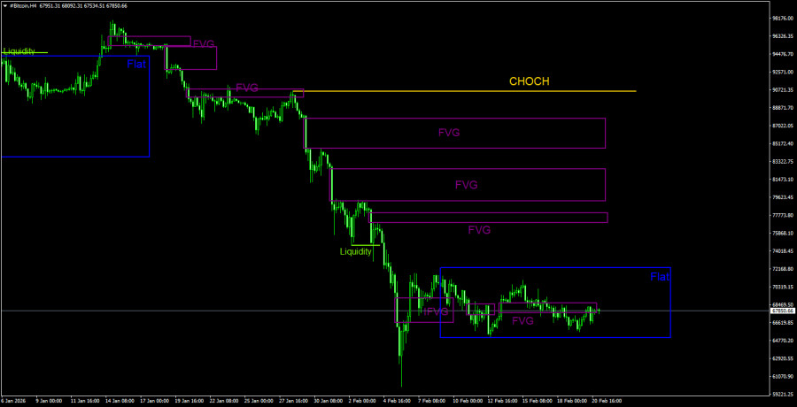 Биткоин в последнюю неделю прочно застрял внутри бокового канала 65000$ – 72000$. Если в прошлом году мы регулярно наблюдали флэт на максимальных значениях или вблизи оных, то сейчас мы наблюдаем флэт уже на минимальных значениях. О чем говорит такое техническое явление? Только о том, что после очередного сильного обвала криптовалютного рынка и «цифрового золота» уже две недели новых покупателей «по выгодным ценам» не находится. Ленты криптоновостей продолжают пестреть заголовками о том, что биткоин в любом случае будет стоить 1 млн $, а институциональные инвесторы продолжают скупать все доступные им монеты. Но факт остается фактом: биткоин не может восстановиться и не демонстрирует никаких признаков начала восходящего тренда. В статье по эфиру мы уже затронули тему отмены тарифов Дональда Трампа Верховным судом США. Многие трейдеры продолжают пытаться связать многие движения на криптовалютном рынке с фундаментальными событиям. Напомним, что биткоин находился в восходящем тренде 3 года. В течение этого времени рынок отрабатывал будущее смягчение монетарной политики ФРС, «халвинг» и другие позитивные факторы. Однако эти факторы уже давно отработаны. Биткоин подешевел в 2 раза за считанные месяцы, потому что начался вполне закономерный нисходящий тренд. А биткоин любит терять до 70-80% стоимости в рамках нисходящих трендов. В прошлом году многие эксперты сообщали, что криптовалютный рынок реагирует на тарифы Дональда Трампа. Однако хотим заметить, что в течение 2025 года биткоин демонстрировал, как рост, так и падение. И никакой связи с новыми тарифами, повышением тарифов или отменой тарифов выявлено не было. Все это лишь выдуманные объяснения тому или иному движению, чем грешит 80% экспертов любого рынка.