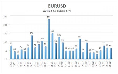 Валютная пара EUR/USD в течение пятницы торговалась с минимальным повышением, но в целом волатильность была достаточно средней. Европейская валюта находилась в падении с прошлой среды, когда в Штатах были опубликованы отчеты NonFarm Payrolls и уровень безработицы. Для нас до сих пор остается загадкой, почему провальные данные за 2025 год были проигнорированы рынком, а январские позитивные – отработаны. Тот же вопрос касается и отчета по инфляции в пятницу. Если индекс потребительских цен приближается к целевому уровню ФРС, это означает только одно – жесткая монетарная политика больше не нужна. Однако это далеко не весь список странностей за последние две недели. На этой неделе рынок продолжал покупать доллар на фоне достаточно средней по значимости макроэкономической статистики. Данные по строительному сектору или заказам на товары долгосрочного использования, конечно, тоже важны, но те же заказы в январе сократились на 1,4%. Что позитивного в этом значении? То, что оно оказалось не таким плохим, как прогнозировалось? Апофеозом абсурда стала пятница. В Евросоюзе и Германии вышли достаточно неплохие отчеты по деловой активности в секторах услуг и производства, и рынок никак на них не отреагировал. В Штатах вышел провальный отчет по ВВП за четвертый квартал, и рынок никак не отреагировал. В этот момент на вопрос «что происходит?» стало еще труднее дать вменяемый ответ. Доллар США по итогу рос полторы недели подряд, учитывая тот факт, что никаких особо позитивных вестей он не получал, а глобальный фундаментальный фон остается без изменений. Уже в эти выходные Дональд Трамп может отдать приказ и крупнейшей в современной истории военной операции в Иране, а, по сути, об объявлении войны. То количество военно-морских сил, которые Трамп сосредоточил вблизи Персидского залива, находятся там явно не просто так. Скорее всего, Трамп хочет осуществить государственный переворот, а заодно – уничтожить все ядерные и военные объекты страны, чтобы затем вновь выступить победителем и миротворцем для всего мира. Ведь только Трамп может нивелировать «иранскую ядерную угрозу». Правда, весь мир не особо-то поддерживает инициативы президента США. Наиболее влиятельные государства, к примеру, отказались участвовать с Совете мира, председателем которого будет сам Трамп. При чем пожизненно. Многие европейские страны попросту отказались вносить 1 млрд долларов, сообщив, что существуют проблемы и поважнее создания еще одного ООН. Канада в то же время начала сближение с Китаем и Евросоюзом и даже хочет организовать Трансатлантический торговый альянс, в котором не будет места Америке. Канадский народ на провокационный вопрос исследования «Хотели бы вы присоединиться к Евросоюзу?» ответил «Да». Великобритания и Франция отказали Трампу в предоставлении своих военных баз для проведения атак на Иран. А сам Иран поднял свою армию и готов отражать любые атаки США. «Вишенкой на торте» в пятницу вечером стало решение Верховного суд США о незаконности введения всех торговых пошлин Дональда Трампа. Решение Верховного суда, в котором шестеро судей из девяти были назначены самим Трампом или другими президентами-республиканцами. Вероятно, о падающем рейтинге Трампа и крайне низкой вероятности победы республиканцев на выборах в ноябре говорить даже не нужно... Средняя в