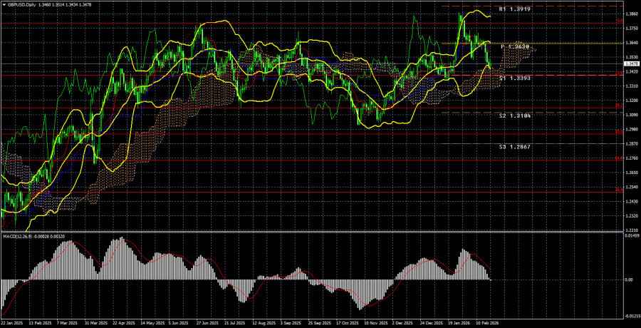 Валютная пара GBP/USD в течение пятницы также торговалась весьма спокойно. В статье EUR/USD мы уже разобрались с вопросами алогичности движений в последние полторы недели, а также полного игнорирования рынком отдельных, важных событий. Продолжаем разбираться. Вчера вечером Верховный суд США постановил, что Трамп не имел никакого права на основании закона IEEPA(Закон о чрезвычайных полномочиях) вводить какие-либо пошлины против целых государств. Суд постановил, что решение о пошлинах может принять лишь Конгресс, а Дональд Трамп превысил свои полномочия. Таким образом, по итогу Белый Дом должен вернуть порядка 150 млрд $ пошлин компаниям, корпорациям и конечным потребителям, так как все сборы были незаконными. Экономисты уже подсчитали, что пошлины Трампа обошлись каждому американскому домохозяйству США в среднем в 1 100$. Если вы думаете, что это конец сумасшедшей пятницы, то вы ошибаетесь. Буквально через час Лидер американской нации и Хозяин мира сего заявил, что ему плевать на решение Верховного суда. Он оставляет все пошлины в силе, а также(внимание!) вводит дополнительные пошлины для всех стран мира в размере 10%. Также Трамп сообщил о повышении торговых сборов за импорт всех автомобилей из-за рубежа. На этот раз президент США обосновал свое решение торговым законом, который известен, как раздел 122. Эксперты отмечают, что такие пошлины могут действовать лишь на протяжении 150 дней, если Конгресс США не одобрит их продление. Как и предупреждал сам Трамп, если Верховный суд отменит его торговые барьеры, он вернет их посредством других законов. Однако на текущий момент не совсем ясно, как такое возможно, что президент США отказывается выполнять постановление Верховного суда? Возможно, Трамп действительно может ввести торговые пошлины на основании других законов, в которых тоже нет ни одного упоминания слова «пошлина». А затем суды еще год будут решать, были ли новые пошлины законными. Однако в любом случае, если первая порция пошлин является незаконной, значит они подлежат отмене, а все собранные средства – возврату. Это в любом случае сильный удар по американскому бюджету, который и без того трещит по швам. Также, вероятно, предусмотрена какая-то ответственность за неисполнение решения Верховного суда. Похоже, 2026 год станет годом новых попыток отстранить Дональда Трампа с должности президента. Для нас остается загадкой, как американский народ мог во второй раз проголосовать за Трампа, если он отлично понимал, что его ждет? Впрочем, нам остается лишь наблюдать за этим абсурдом и комедией. Самое странное во всей этой ситуации, что рынок фактически все новости пятницы проигнорировал. А доллар, тем временем, продолжает расти. Отмена пошлин, безусловно – позитивный сигнал для американской экономики, но Трамп пока остается президентом. А значит может натворить еще очень много дел. Поэтому мы не видим никаких причин радоваться, а доллару США – расслабляться. Средняя волатильность пары GBP/USD за последние 5 торговых дней составляет 86 пунктов. Для пары фунт/доллар это значение является «средним». В понедельник, 23 февраля, таким образом, мы ожидаем движения внутри диапазона, ограниченного уровнями 1,3392 и 1,3564. Старший канал линейной регрессии направлен вверх, что указывает на восстановление тренда. Индикатор CCI заходил в область перепроданности, что 