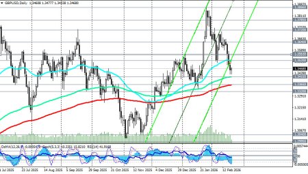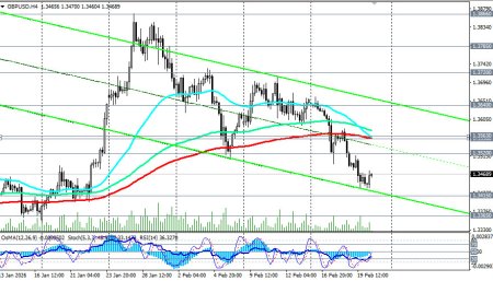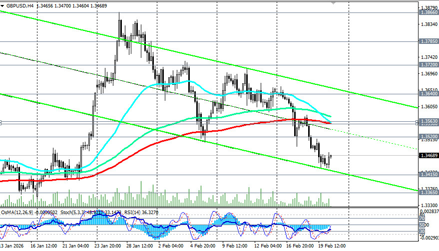 *) см. также: Торговые индикаторы InstaForex по GBP/USD Пара GBP/USD завершает неделю в зоне месячных минимумов, развивая сильный нисходящий импульс, сформированный в начале недели. В пятницу, 20 февраля, пара тестирует уровень 1.3440 на пробой вниз, продемонстрировав пятый день непрерывного падения подряд. Текущая ситуация отражает редкое сочетание фундаментальных и технических факторов: расхождение в монетарной политике Банка Англии и ФРС США, противоречивые макроэкономические данные из Великобритании и технический пробой зоны ключевых краткосрочных уровней поддержки.Дивергенция монетарной политики Основным драйвером ослабления фунта стало растущее расхождение в ожидаемых действиях двух центробанков. Рынок закладывает в цены вероятность снижения ставки Банком Англии в марте на 90%. Экономические данные полностью оправдывают эти ожидания: предварительный ВВП Великобритании в 4-м квартале вырос лишь на 0,1% (при прогнозе 0,2%), а уровень безработицы достиг 5,2% — максимума за десятилетие, исключая период пандемии. Сила доллара: ястребиный оттенок риторики ФРС Противоположная ситуация складывается в США. Опубликованные протоколы январского заседания FOMC имели отчетливый «ястребиный оттенок» — несколько участников допустили возможность дальнейшего повышения ставок, если инфляция останется выше целевого уровня. Снижение ставки в марте теперь полностью исключено, и рынок закладывает от одного до двух снижений на весь 2026 год. Данные по рынку труда США усиливают эту позицию: безработица снизилась до 4,3%, а занятость выросла в январе на 130 тыс., что поддерживает доллар на уровнях, близких к максимальным с 23 января. Индекс доллара USDX укрепился в районе 97.80–98.00, оказывая дополнительное давление на пару GBP/USD. Смешанные сигналы британской экономики Неожиданная поддержка от розничных продаж В пятницу утром фунт получил краткосрочную поддержку от неожиданно сильных данных по розничным продажам в Великобритании за январь. Показатель розничных продаж вырос на 1,8% в месячном выражении (при прогнозе 0,2%) и на 4,5% в годовом (против ожидаемых 2,8%). Кроме того, положительную динамику британскому фунту обеспечили предварительные индексы деловой активности PMI (от S&P Global). Предварительный составной индекс PMI показал неожиданный рост до уровня 53,9 в феврале против январского значения в 53,7. Это значительно превышает ожидаемый показатель в 53,4 пункта. При этом, сектор производства проявил себя лучше всех ожиданий, существенно повысив общий уровень активности и способствуя росту составного индекса PMI. Индикатор производственной сферы достиг отметки 52,0, превзойдя предыдущие оценки и значение января (51,8). При этом сфера услуг, хотя и показала некоторое снижение с 54,0 до 53,9 пункта, всё равно сохранила высокие показатели и уверенно удержалась выше первоначальных прогнозов в 53,6 пункта. Эти факторы совместно оказали позитивное влияние на фунт, что позволило паре GBP/USD ненадолго подняться к внутридневному максимуму 1.3477. Фундаментальная слабость сохраняется Однако более широкая картина остается негативной: