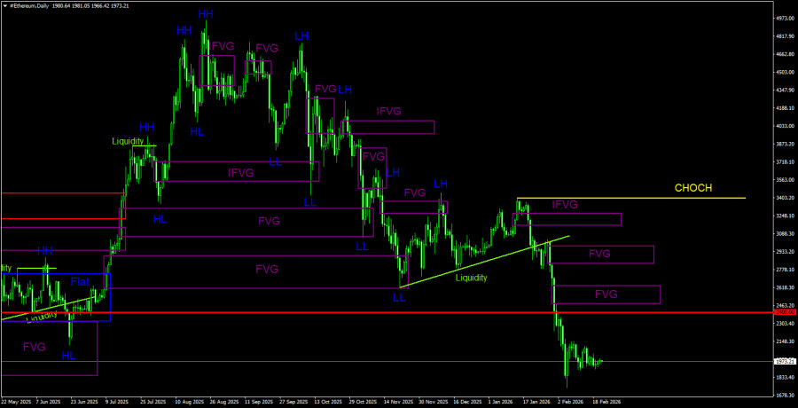 Биткоин продолжает формирование полноценного нисходящего тренда. Мы продолжаем ожидать падения с целью 57 500$(уровень 61,8% по Фибоначчи от трехлетнего восходящего тренда), а признаков разворота тренда в данное время ни одного. Но даже уровень 57 500$ теперь не выглядит, как конечная остановка. Из областей POI на продажу на дневном ТФ можно отметить последний «медвежий» FVG, до которого биткоину еще очень далеко. На 4-часовом ТФ имеется три неотработанных «медвежьих» FVG, однако эти паттерны принадлежат к предыдущему движению и располагаются гораздо выше текущей цены. Они вряд ли спровоцируют возобновление тренда.Рекомендации по торговле ETH/USD: