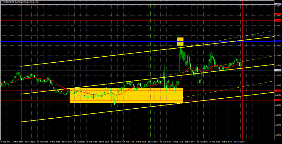 Валютная пара EUR/USD в течение пятницы показала незначительный рост, но событий в течение дня было огромное количество, а волатильность – вновь достаточно слабая. Похоже, что рынок до конца не разобрался, что делать со всей полученной информацией, потому что во второй половине дня курс пары начал скакать то вверх, то вниз со страшной скоростью. Напомним, что в пятницу в Евросоюзе были опубликованы вполне неплохие отчеты по деловой активности. В Германии были опубликованы неплохие отчеты по деловой активности. В Америке главный отчет дня – по ВВП за четвертый квартал – провалился с треском, показав значение в два раза ниже прогноза. А под занавес дня и недели Верховный суд США порадовал трейдеров отменой пошлин Дональда Трампа, признав их незаконными, а сам Дональд Трамп тут же ввел новые пошлины, которые успешно поднял до 15% на следующий день. От такого количества информации у трейдеров голова пошла кругом. С технической точки зрения, нисходящая тенденция на часовом ТФ сохраняется. Цена не сумела преодолеть область 1,1750-1,1760, но и выше критической линии закрепиться не смогла. Таким образом, теоретически, доллар может продолжить рост точно также, как и в две последние недели. Факторов поддержки у него по-прежнему немного, зато факторов падения – стало еще больше. Однако рынок в данное время настроен на техническую коррекцию в рамках глобального восходящего тренда. На 5-минутном ТФ в пятницу было сформировано два торговых сигнала. В течение 10 часов цена пыталась сформировать отскок от области 1,1750-1,1760, что в конечном счете ей удалось сделать. Трейдеры могли открывать длинные позиции по этому сигналу. Затем случился «взлет» к линии Киджун-сен, от которой цена также отскочила. Поэтому следом трейдеры могли открывать уже короткие позиции. Обе сделки оказались прибыльными.Советуем ознакомиться с другими статьями автора:
