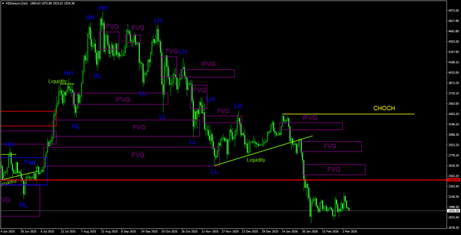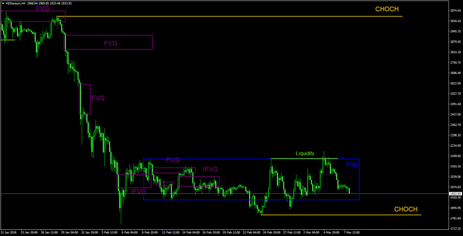 На 4-часовом таймфрейме также хорошо виден тотальный обвал, после которого цена уже месяц торгуется в боковом канале. При чем флэт достаточно узкий. На этой неделе была сформирована девиация верхней границы бокового канала. Таким образом, те трейдеры, которые прислушиваются к нашим рекомендациям, могли открыть короткие позиции, которые сейчас находятся в хорошей прибыли. Скорее всего, нижняя граница будет отработана уже сегодня. Так как тренд остается нисходящим даже на 4-часовом ТФ, каждая девиация верхней границы – это потенциально снятие ликвидности перед новым витком тренда. Вторая линия CHOCH поддерживает коррекционную структуру, не более. Она существует исключительно для наглядности.Рекомендации по торговле ETH/USD: