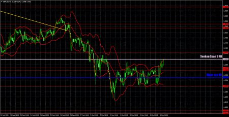 На часовом таймфрейме пара GBP/USD давно могла перейти к формированию восходящей тенденции, но геополитика утянула фунт стерлингов в пучину. Несмотря на сильное падение пары в феврале-марте, мы по-прежнему расцениваем его, как коррекцию. Дневной ТФ уверенно сигнализирует о сохранении восходящего тренда. К сожалению, геополитика – штука очень непредсказуемая и способна оказывать влияние настроение рынка. Что мы сейчас и наблюдаем. На 9 марта мы выделяем следующие важные уровни: 1,3096-1,3115, 1,3201-1,3212, 1,3307, 1,3369-1,3377, 1,3437, 1,3533-1,3548, 1,3615, 1,3671-1,3681, 1,3751-1,3763. Линии Сенкоу Спан Б (1,3412) и Киджун-сен (1,3341) также могут быть источниками сигналов. Уровень Stop Loss рекомендуется выставлять в безубыток при прохождении цены в верном направлении 20 пунктов. Линии индикатора Ишимоку в течение дня могут перемещаться, что следует учитывать при определении торговых сигналов. На понедельник в Великобритании и США не запланировано важных событий. Таким образом, на первом месте будут вновь стоять геополитические факторы. Если важных сообщений из Ирана или связанных с иранской войной не поступит, пара может продолжить восстановление. Однако британскому фунту важно преодолеть линию Сенкоу Спан Б.Торговые рекомендации: