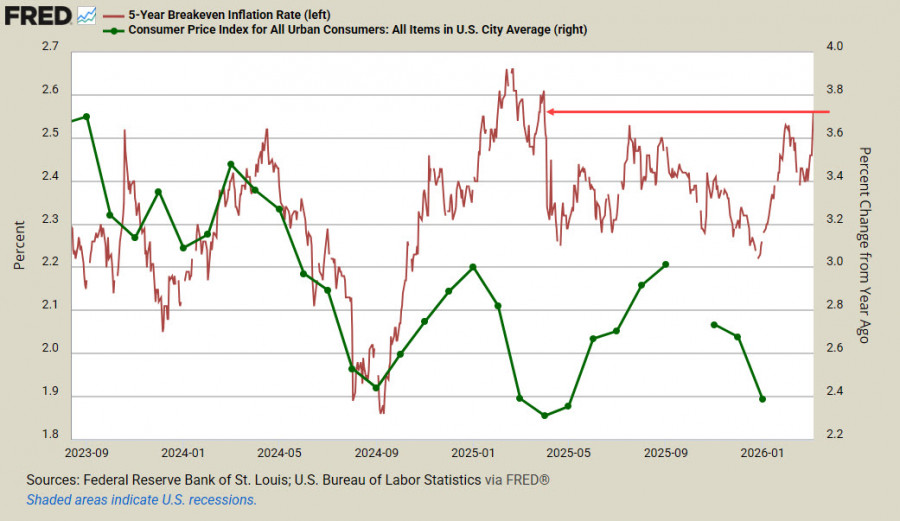 Что же касается экономики США, то здесь все печально, и нет никаких причин для роста спроса на доллар, кроме одной – резкого роста инфляционных рисков. Инфляция никак не могла остаться в стороне после удорожания импорта после ввода повышенных тарифов, и даже отмена инициатив Трампа Верховным судом в краткосрочной перспективе ничего не изменит. Рост же цен на нефть добавляет к этим рискам новую, еще более очевидную угрозу. Тампу даже пришлось прокомментировать очевидное в воскресенье, правда, сделал он это в своей обычной манере, назвав себя умным, а остальных – дураками. «Краткосрочные цены на нефть, которые быстро упадут после того, как будет устранена иранская ядерная угроза, — это очень небольшая цена, которую США готовы заплатить», заявил Трамп, не уточнив, почему он считает рост цен краткосрочным и каким образом собирается победить без наземной операции и в условиях недостатка ракет для массированных ударов. Доходность 5-летних облигаций TIPS, защищенных от инфляции, резко выросла к закрытию пятницы, добравшись до годовых максимумов. Это один из самых надежных индикаторов роста инфляционных ожиданий.