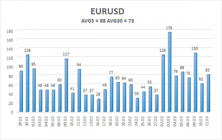 Валютная пара EUR/USD в течение среды не смогла развить северный импульс, а оптимизм и надежды на рынках тут же сменились осознанием суровой действительности. Дональд Трамп – всему виной. Кратко напомним, что на выходных Дональд Трамп сообщил, что не исключает возможное проведение наземной операции в Иране, но, по его словам, для этого должны существовать очень веские причины. Что могли прочитать рынки в этих словах? Добиться целей не удается. Иначе зачем проводить наземную операцию с участием огромного количества солдат и техники, часть которых наверняка будет уничтожена? Доллар начал неделю с нового роста. Однако уже в понедельник Дональд Трамп сообщил, что война в Иране близится к своему завершению. Чуть позже лидер Белого дома сообщил, что американские ВМС будут сопровождать танкеры в Персидском заливе, что позволит нефти из региона вновь поступать на мировые рынки. Нефть тут же обвалилась со 119$ до 85$, а доллар начал падать. Естественно, ведь конфликт почти завершен, а нефтяной шок – разрешен. Так сказал Трамп! Однако в среду стало известно, что Иран начал минирование Персидского залива и пообещал, что ни одно судно без его согласия не пройдет через Ормузский пролив. И спрашивается, кто глаголет истину? Кого слушать, кого – нет? Поэтому рынки продолжает «колбасить» в прямом смысле этого слова. Каждый день поступают сообщения, которые противоречат предыдущим сообщениям и новостям. Трамп уже пообещал ликвидировать нового верховного аятоллу Ирана, сына Али Хаменеи, если тот не пойдет на уступки США. Однако эксперты тут же заявили, что ни на какие уступки Хаменеи-младший идти не собирается. Как и весь иранский народ. Политологи и военные эксперты в один голос заявляют, что победой для Ирана будет просто сохранение своей государственности, политики и религии. Проще говоря, неважно, сколько объектов Израиль и США разнесут в регионе, Тегеран все отстроит заново, восстановит ядерные объекты, будет вновь создавать баллистические ракеты и ненавидеть США. А захватить Иран, мягко говоря, не получится без миллионных потерь среди личного состава и огромного количество кораблей, самолетов и различной техники. Если Трамп пойдет на проведение наземной операции, госдолг США полетит вверх с еще большим задором. Или инфляция, если ФРС включит печатный станок, чтобы как-то финансировать геополитические амбиции Трампа. В то же время Иран может показать всему миру, как противостоять геополитическим замашкам американского президента. Хороший пример для Евросоюза, который, похоже, если на него надавить посильнее, просто отдаст Гренландию Америке в вечное пользование. Если Трампу не сопротивляться, весь мир будет плясать под дудку США. Но доллар явно испытывает удовольствие от международной политики Трампа, так как большинство инвесторов и капиталистов по-прежнему его используют в качестве «резервной валюты». Таким образом, до реальной деэскалации конфликта на Ближнем Востоке мы можем еще не раз увидеть рост доллара, вне зависимости от макроэкономической статистики в Штатах. Средняя волатильность валютной пары EUR/USD за последние 5 торговых дней по состоянию на 12 марта составляет 88 пунктов и характеризуется, как «средняя». Мы ожидаем движение пары между уровнями 1,1484 и 1,1660 в четверг. Старший канал линейной регрессии развернулся вбок, что указыв