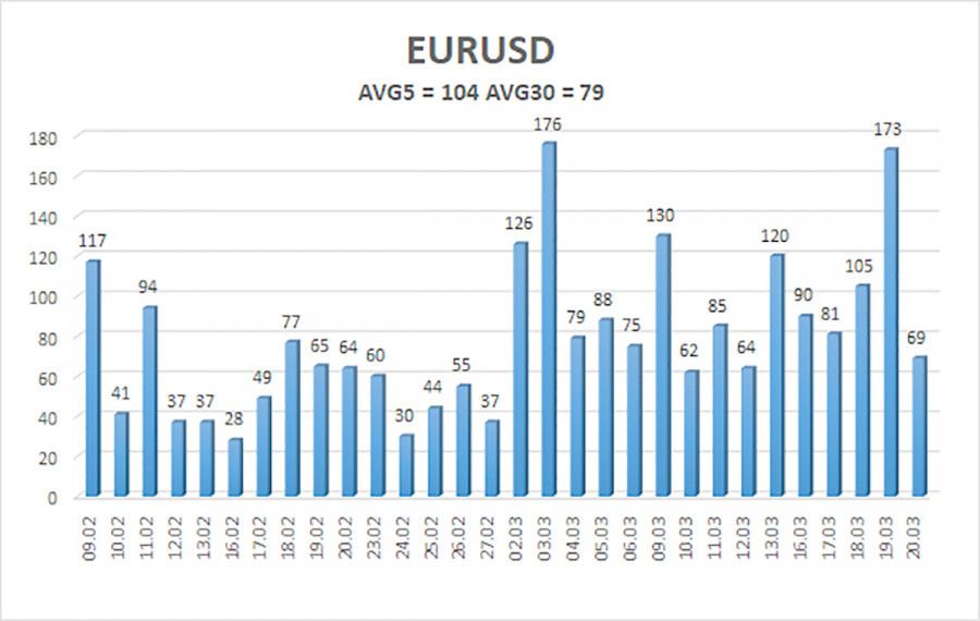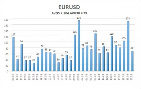 Валютная пара EUR/USD в течение пятницы попыталась продолжить зарождающееся движение на Север, но получилось откровенно плохо. В то же время британский фунт рухнул вниз, как камень, не имея для этого особых причин. Таким образом, по прошествии предыдущей недели трейдеры получили важную информацию от центральных банков, которая открывает все двери перед быками. Однако сами быки могут не обладать желанием войти в эти двери, а сами двери могут быть подперты с другой стороны шкафами в виде геополитических событий. По сути, ЕЦБ дал зеленый свет на ужесточение монетарной политики, в отличие от ФРС. Таким образом, рост европейской валюты был бы полностью закономерным в ближайшее время и на основании фундамента, и на основании технической необходимости коррекции. Но будут ли эти факторы иметь хоть какое-то значение для рынка? На выходных Дональд Трамп сообщил, что, если Иран не разблокирует Ормузский пролив в течение 48 часов, Америка нанесет сокрушительный удар по энергетическим объектам. Мы вот почему-то считаем, что Иран не разблокирует Ормузский пролив под давлением любых угроз, потому что Тегеран уже несколько раз показал – никакие угрозы ему не страшны, а терять стране в общем-то нечего. Таким образом, уже в понедельник или во вторник Штаты могут нанести новый удар по иранской инфраструктуре, а что будет дальше, наверное, все понимают. Новая серия ответных ударов по нефтегазовой инфраструктуре в регионе, по американским военным базам. А когда эти объекты закончатся, Иран начнет наносить удары на более дальние расстояния. Буквально недавно Иран нанес удар по американской военной базе, находящейся более, чем в 2 000 км. Таким образом, необходимые ракеты для дальних ударов в распоряжении Тегерана имеются. А это – новый виток эскалации конфликта, расширение его географии, потенциально удар по европейским странам. Таким образом, вне зависимости от геополитики, вне зависимости от макроэкономического фона доллар может начать снова расти практически в любой момент. Конечно, мы, как и все здравомыслящие люди, надеемся, что обстановка на Ближнем Востоке не станет еще хуже, чем сейчас. Иначе цены на нефть действительно могут вырасти до 200$ за баррель. Однако главный миротворец современности Дональд Трамп продолжает считать Иран главной угрозой для всего мира, а себя – спасителем всего мира от иранской угрозы. Трамп может в любой момент завершить эту войну, но что это уже изменит? Иран не собирается завершать противостояние. Трамп разворошил осиное гнездо, а теперь всеми силами делает вид, что стремится разблокировать Ормузский пролив и завершить конфликт. Очередная хорошая мина при плохой игре. Таким образом, если бы не геополитика, мы бы, как и ранее, ожидали только рост европейской валюты. Но в этом случае трейдерам крайне важно постоянно отслеживать новости с Ближнего Востока, чтобы быть готовыми к новому падению пары EUR/USD. Средняя волатильность валютной пары EUR/USD за последние 5 торговых дней по состоянию на 23 марта составляет 104 пункта и характеризуется, как «средняя». Мы ожидаем движение пары между уровнями 1,1468 и 1,1676 в понедельник. Старший канал линейной регрессии развернулся вбок, что указывает на разворот тренда. Индикатор CCI вновь заходил в область перепроданности и сформировал «бычью» дивергенцию, что в очередной раз предупредило за