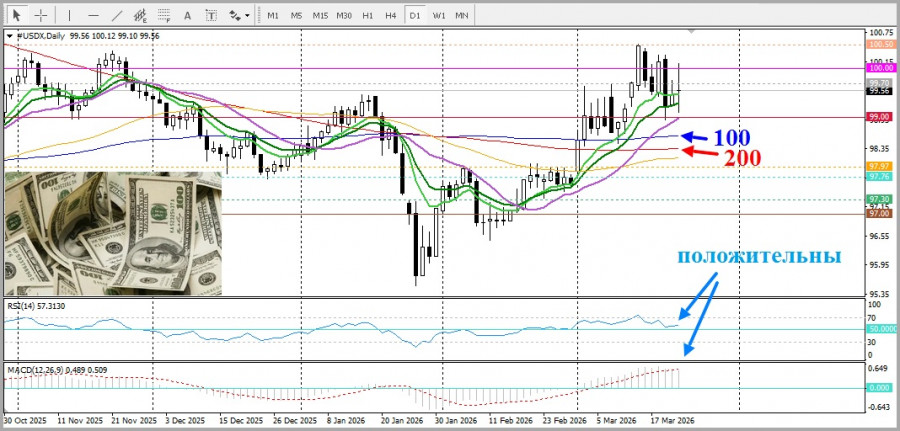 Это по-прежнему поддерживает высокие цены на нефть, усиливая опасения относительно инфляции и побуждая инвесторов пересматривать ожидания по снижению процентных ставок Федеральной резервной системой США в 2026 году.Такой фон дополнительно играет на руку доллару США. Между тем на прошлой неделе Центральный банк США дал сигнал лишь об одном снижении ставки в текущем году. При этом крупнейшие центральные банки мира, напротив, обозначили готовность к возможному повышению процентных ставок для сдерживания возобновившегося инфляционного давления. Это, в свою очередь, ограничивает агрессивные покупки доллара и оказывает сдерживающее влияние на индекс доллара DXY. Вместе с тем смешанный фундаментальный фон требует осторожности до появления более устойчивого краткосрочного направления движения. А с технической точки зрения осцилляторы на дневном графике положительные, индекс торгуется выше всех скользящих средних, поддерживая быков. Но стоит обратить внимание, что важные 100- 200-дневные скользящие средние выглядят более ровно, чем под наклоном, что сигнализирует о боковом движении в ближайшей перспективе.Материал предоставлен компанией InstaForex - www.instaforex.com