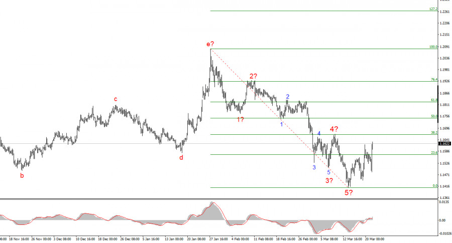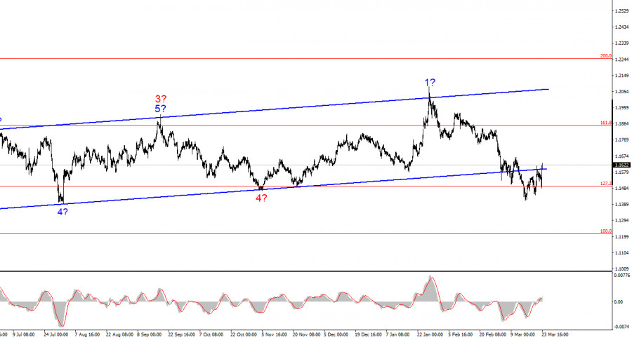 Курс инструмента EUR/USD в течение понедельника повысился на 90 базовых пунктов, а до конца дня может прибавить еще больше. День начался с очередного укрепления американской валюты, что явно не понравилось хозяину Белого дома. Поэтому Трамп решил вмешаться в этот валютный беспредел и сообщил об удачных переговорах с Тегераном, которые могут привести к завершению войны на Ближнем Востоке в ближайшее время. Вследствие этого, президент США решил отменить на 5 дней удары по энергетике Ирана. Вероятно, когда в Тегеране услышали это заявление, то долго смеялись. Или недоумевали. А потом сделали официальное заявление о том, что никакие переговоры с Вашингтоном не ведутся, а Трамп просто испугался ответных ударов по энергетике союзников на Ближнем Востоке, которые могут оставить целые страны не только без электроэнергии, но и без питьевой воды и интернета. И, честно говоря, заявлениям первых лиц Ирана хочется верить, а Трампу – не очень. В очередной раз складывается ощущение, что Трамп просто манипулирует рынками, добиваясь определенных движений, заставляя трейдеров и инвесторов торговать в нужную ему сторону. От высоких цен на нефть Америка только выигрывает, о чем говорил сам Трамп, но в то же время доллар существенно вырос в цене в последние полтора месяца, что негативно отразится на и без того отрицательном торговом балансе. Собирать пошлины в прежних объемах Дональд Трамп больше не может, постоянно манипулировать и угрожать пошлинами – тоже. Остается только манипулировать геополитикой и рынками. В целом, Трамп добился снижения курса американской валюты. Согласно текущей волновой разметке, именно это нам и нужно. Инструмент EUR/USD растет и пускай это лишь коррекционный рост, это уже хотя бы что-то прогнозируемое.Общие выводы.