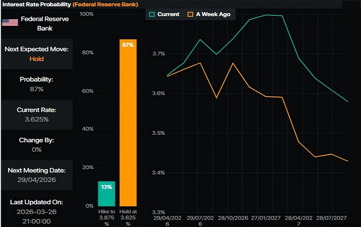 Макроданные из США остаются относительно стабильными: количество первичных заявок на пособие по безработице за неделю, закончившуюся 21 марта, составило 210 тыс., совпав с прогнозами аналитиков и предыдущим показателем 205 тыс. Этот результат подтверждает силу рынка труда и дает ФРС пространство для сохранения жесткого подхода к борьбе с инфляцией.