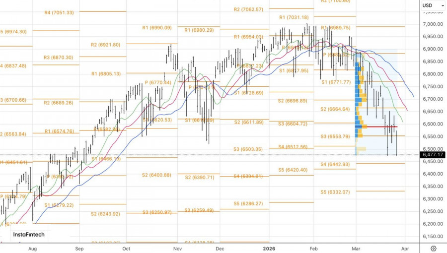 Когда put Трампа не работает, ФРС не собирается снижать ставки, а инвесторы потеряли веру в быстрое разрешение геополитического конфликта на Ближнем Востоке широкому фондовому индексу ничего не остается как последовать примеру Russell 2000 и Nasdaq Composite и уйти на территорию коррекции. Время работает не на него. Технически на дневном графике S&P 500 усиливается откат к нисходящему тренду. Об этом свидетельствует отдаление котировок от скользящих средних. Сформированные от минимума пин-бара вблизи отметки 6565 шорты можно будет нарастить в случае уверенного прорыва локальных минимумов вблизи 6470. Таргеты на 6420 и 6290 сохраняют свою актуальность. Материал предоставлен компанией InstaForex - www.instaforex.com