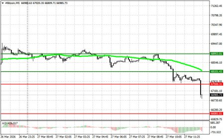 Биткоин, как и ожидалось, продолжил свое падение и уже достиг уровня в $66 800. Эфир остановился на отметке в $2000, которая является важным психологическим уровнем.Распродажа на рынке криптовалют как раз совпала с моментом, когда биржевые инвестиционные ETF фонды зафиксировали самый большой отток средств за последние три недели. Согласно данным SoSoValue, из семи фондов, инвестирующих в спотовый биткоин, был зафиксирован чистый отток средств в размере 171,2 миллиона долларов, что стало крупнейшим дневным оттоком с 6 марта. Среди ETF наибольший отток средств зафиксирован у IBIT от BlackRock — 41,9 миллиона долларов, а из других фондов от Fidelity, Bitwise и Ark отток составил более 30 миллионов долларов каждый.Однако некоторые связывают этот отток средств больше с фиксацией прибыли и ее выводом, чем с уходом крупных игроков. Институциональные инвесторы все еще сохраняют осторожный оптимизм в отношении криптовалют на фоне сохраняющегося интереса к биткоину и растущего признания токенизированных традиционных активов. Но в краткосрочной перспективе на рост биткоина и эфира рассчитывать не стоит.Что касается внутридневной стратегии на криптовалютном рынке, то действовать дальше буду, также опираясь на любые крупные просадки биткоина и эфира в расчете на продолжение развития бычьего рынка в долгосрочной перспективе, который никуда не делся. Что касается краткосрочной торговли, то стратегия и условия описаны ниже. BitcoinСценарий на покупку Сценарий №1: покупать биткоин сегодня буду при достижении точки входа в районе $68 100 с целью роста к уровню $68 900. В районе $68 900 буду выходить из покупок и продавать сразу на отскок. Перед покупкой на пробой нужно убедиться в том, что 50-дневная средняя скользящая находится ниже текущей цены, а индикатор Awesome находится в зоне выше нуля. Сценарий №2: покупать биткоин можно от нижней границы $67 500 при отсутствии рыночной реакции на ее пробой в обратную сторону к уровням $68 100 и $68 900.Сценарий на продажу Сценарий №1: продавать биткоин сегодня буду при достижении точки входа в районе $67 500 с целью падения к уровню $66 000. В районе $66 000 буду выходить из продаж и покупать сразу на отскок. Перед продажей на пробой нужно убедиться в том, что 50-дневная средняя скользящая находится выше текущей цены, а индикатор Awesome находится в зоне ниже нуля. Сценарий №2: продавать биткоин можно от верхней границы $68 100 при отсутствии рыночной реакции на ее пробой в обратную сторону к уровням $67 500 и $66 000.EthereumСценарий на покупкуСценарий №1: покупать эфир сегодня буду при достижении точки входа в районе $2050 с целью роста к уровню $2088. В районе $2088 буду выходить из покупок и продавать сразу на отскок. Перед покупкой на пробой нужно убедиться в том, что 50-дневная средняя скользящая находится ниже текущей цены, а индикатор Awesome находится в зоне выше нуля. Сценарий №2: покупать эфир можно от нижней границы $2026 при отсутствии рыночной реакции на ее пробой в обратную сторону к уровням $2050 и $2088.Сценарий на продажуСценарий №1: продавать эфир сегодня буду при достижении точки входа в районе $2026 с целью падения к уровню $1972. В районе $1972 буду выходить из продаж и покупать сразу на отскок. Перед продажей на пробой нужно убедиться в том, что 50-дневная средняя скользящая находится выше текущей цены, а индикатор Awesome находится в зоне ниже нуля. Сценарий №2: продавать эфир можно от верхней г