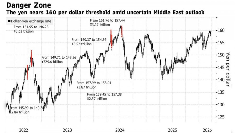 На войне все средства хороши. Япония ведет борьбу со спекулянтами, искусственно занижающими курс иены. Такова официальная позиция правительства. При этом Сацуки Катаяма говорит о готовности действовать смело и по всем фронтам. Министра финансов беспокоит влияние нефти на котировки USD/JPY. А по рынку ходят слухи, что Токио намерен вмешиваться в жизнь не только валютного, но и сырьевого рынков. Экономика Японии зависима от поставок энергетических товаров, 90% из которых идет с Ближнего Востока. Приходится договариваться с Ираном, который не пропускает через Ормузский пролив танкеры недружественных стран. Это удерживает Токио от оказания помощи требующему сопровождения кораблей военными Дональду Трампу. При этом рост цен на нефть усиливает потребности импортера в долларах США для оплаты. Это приводит к снижению курса иены. Одновременно гринбэк укрепляется против основных мировых валют благодаря статусу актива-убежища. В результате USD/JPY растет как на дрожжах, что вынуждает правительство проводить вербальные интервенции. В 2024 вмешательство в жизнь Forex оказалось удачным от текущих уровней благодаря ослаблению доллара США. Без завершения конфликта на Ближнем Востоке на это рассчитывать сложно. Поэтому Министерство финансов готово действовать по всем фронтам. Динамика USD/JPY и валютных интервенций Японии