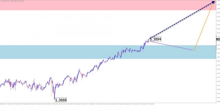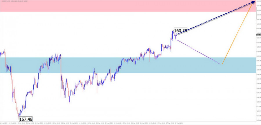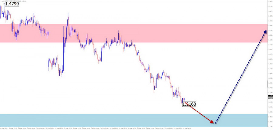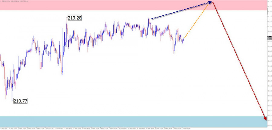 EUR/USD Анализ: В краткосрочном масштабе цена пары евро/доллар США перемещается на графике согласно алгоритму последней, незавершённой на сегодня нисходящей волны от 28 января текущего года. На протяжении последних недель цена формировала коррекцию, в виде растянутой плоскости. К настоящему времени структура волны не показывает завершенности. Котировки пары находятся в середине плоского ценового коридора между зоны потенциального разворота разного масштаба. Прогноз: В ближайшие дни можно рассчитывать на завершение нисходящего курса движения курса евро, вплоть до границ расчётной поддержки. Во второй половине недели ожидается формирование разворота и возобновление ценового подъёма. Верхней границей недельного хода пары выступает расчётное сопротивление. Зоны потенциального разворота Сопротивление: - 1.1630/1.1680 Поддержка: - 1.1450/1.1400 Рекомендации: Продажи: могут использоваться дробным лотом в рамках интрадей. Покупки: до появления подтверждённых сигналов разворота в районе расчётной поддержки подобные сделки преждевременны. USD/JPY Анализ: Стартовавшая в январе текущего года бычья волна задаёт основное направление ценовым колебаниям мажора японской йены. Незавершенная часть по основному курсу стартовала 19 марта. Котировки достигли границ сильной зоны потенциального разворота. В структуре этого участка волны назрела необходимость промежуточного отката. Прогноз: В ближайшие пару дней ожидается продолжение бокового курса движения. Вероятен нисходящий вектор. Возможно кратковременное давление цены на нижнюю границу расчётной разворотной зоны. Ближе к выходным можно рассчитывать на рост волатильности, разворот и возобновление хода курса пары вверх. Зоны потенциального разворота Сопротивление: - 161.00/161.50 Поддержка: - 159.50/159.00 Рекомендации: Продажи: рискованны, имеют малый потенциал. Покупки: могут использоваться в торговле после появления в районе поддержки подтверждённых сигналов разворота. GBP/JPY Анализ: С апреля прошлого года направление краткосрочного тренда кросса английский фунт/японская йена задаётся восходящей волной. От мощного сопротивления цена с начала февраля цена откатывает вниз, формируя коррекционную часть (В). Её структура на момент анализа не показывает завершенности. Прогноз: В ближайшие пару дней ожидается боковой вектор движения вдоль зоны потенциального разворота. Не исключено кратковременное давление на верхнюю границу зоны сопротивления. К концу недели можно рассчитывать на смену курса и возобновление ценового снижения. Ограничителем хода цены вниз выступит расчетная поддержки. Зоны потенциального разворота Сопротивление: - 213.50/214.00 Поддержка: - 210.30/209.80 Рекомендации: Покупки: рискованны, имеют малый потенциал. Продажи: преждевременны до появления в районе сопротивления подтверждённых сигналов разворота. USD/CAD Анализ: Актуальная на сегодня волновая конструкция мажорной пары канадского доллара ведёт отсчёт с конца января и направлена вверх. Анализ структуры показывает формирование заключительной части волны (С). Цена приближается к нижней границе мощной потенциально-разворотной зоны дневного масштаба графика. Прогноз: На протяжении ближайших дней предстоящей недели ожидается преимущественно боковой вектор ценового движения пары. Более вероятен нисходящий вектор, с возможным давлением на