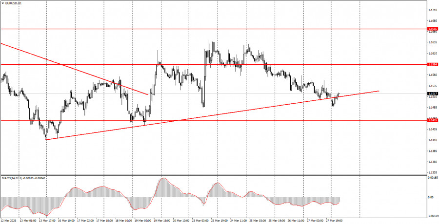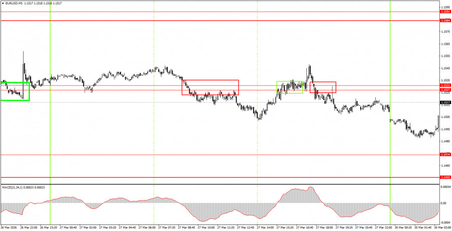 Валютная пара EUR/USD в течение пятницы продолжала слабое нисходящее движение. После взлета котировок пары в понедельник, когда Дональд Трамп неожиданно огорошил рынки информацией об успешных и плодотворных переговорах с Ираном, всю оставшуюся часть недели евровалюта падала, а доллар рос. В этом нет ничего удивительного, так как заявления Трампа ничем не подтвердились в течение недели. Может быть, президент США и ведет с кем-то переговоры, только в Иране об этом ничего не знают. Тегеран даже открыто сообщил, что Трамп ведет переговоры с самим собой, а вся его примирительная риторика направлена на стабилизацию цен на нефть, газ и топливо. Как видим, в очередной раз гениальная задумка Трампа не привела к успеху. Цены на энергоносители продолжают расти, на Ближний Восток продолжают стягиваться американские военные силы, а валютные трейдеры ожидают новый виток эскалации конфликта, поэтому от греха подальше переводят свои капиталы в безопасный доллар.5M график пары EUR/USD.