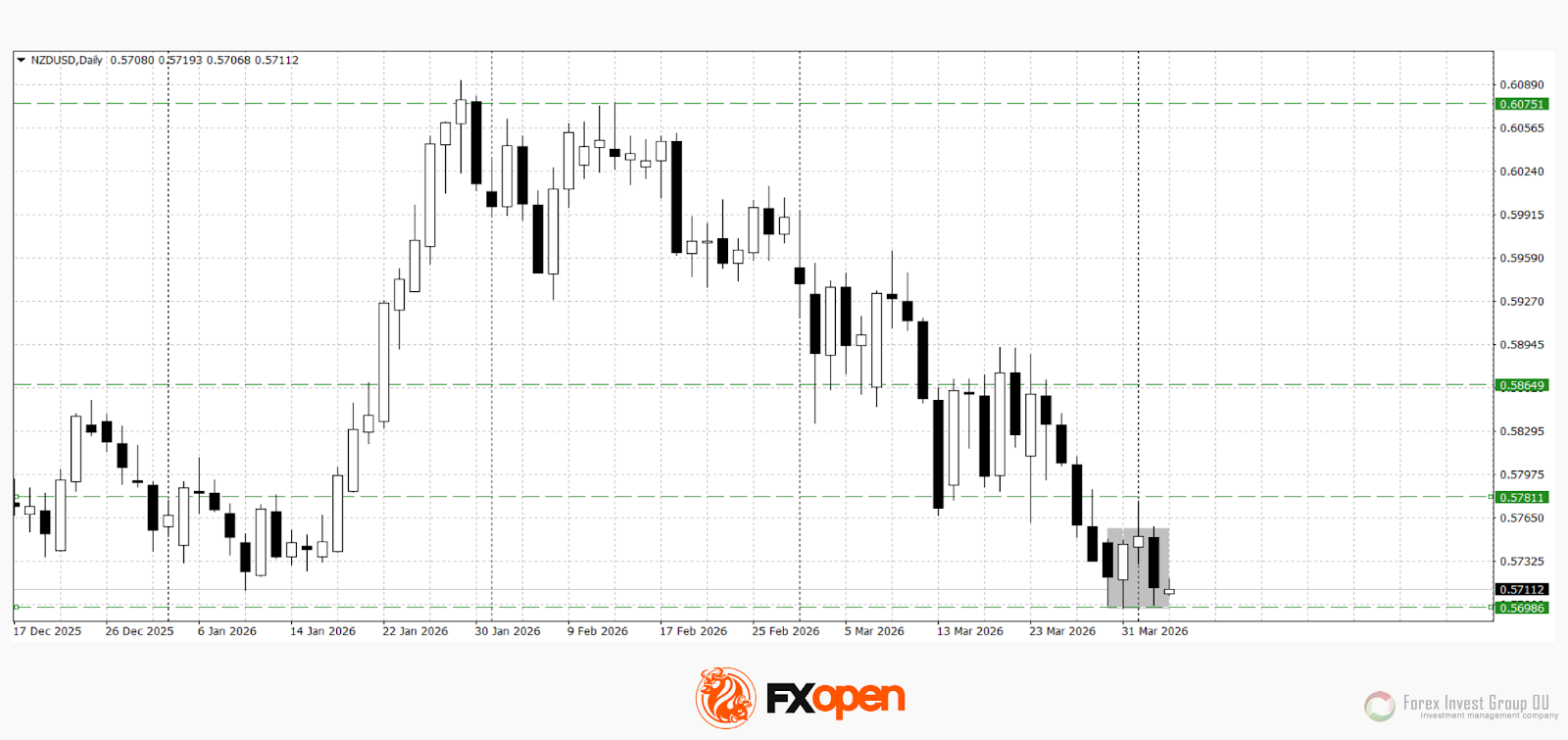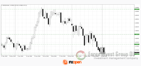 В паре NZD/USD наблюдается боковая торговля в течение нескольких сессий. Покупатели продолжают удерживать поддержку у 0.5700, однако для пробоя вниз и развития нисходящего движения необходим сильный фундаментальный драйвер. В случае закрепления выше 0.5780 возможно развитие более глубокой восходящей коррекции.