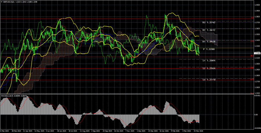 Валютная пара GBP/USD в пятницу также продемонстрировала только одно – полное нежелание двигаться. Рынок как будто уснул и проспал отчеты NonFarm Payrolls и уровень безработицы. Хотя мы предупреждали, что реакция может отсутствовать, хоть и не верили в это до конца. Так или иначе, по тем или иным причинам, но оба важнейших отчета были проигнорированы. С одной стороны, это даже закономерно, ибо ФРС на последнем заседании сделала своей целью номер 1 инфляцию. Таким образом, данные по рынку труда не будут влиять на монетарную политику ФРС в ближайшее время. С другой стороны, сама монетарная политика никакого влияния на курс доллара или британского фунта не оказывает. Напомним, что в прошлом месяце резко возросли шансы на ужесточение монетарной политики Банка Англии и ЕЦБ в 2026 году. При чем, не один раз, а в несколько заходов. Оба центральных банка опасаются резкого роста инфляции, а первые данные по потребительским ценам за март показали – опасения не напрасны. В то же время ФРС не намерена повышать ключевую ставку даже один раз в 2026 году, о чем практически открыто заявил Джером Пауэлл. Таким образом, монетарная дивергенция между ФРС и Банком Англии/ЕЦБ будет сужаться в ближайшее время. Этот фактор всецело поддерживает евро и фунт, но, как мы уже говорили много раз, рынок волнует сейчас только геополитика. Чего в таком случае ожидать в ближайшем будущем от геополитики? К сожалению, проще ответить, сколько песка в Сахаре или же воды в море. Геополитика всецело зависит от Дональда Трампа, а прогнозировать действия американского президента невозможно. Мы готовы предположить, что в ближайшие две-три недели конфликт на Ближнем Востоке сохраниться, но важно также понимать, состоится ли новая эскалация? Напомним, что Трамп пообещал нанести удары по электростанциям Ирана, а заодно отправить страну в каменный век. Вряд ли можно считать, что любой новый удар по Ирану останется без ответа. На этой неделе Тегеран уже нанес первые удары по дата-центрам Amazon, в которых хранятся сервера глобальный сети интернет. Поэтому потенциально весь мир может остаться без интернета, если Иран продолжит свое дело. Британский же фунт, тем временем, вернулся к локальному дну на 4-часовом ТФ, а на дневном – продолжает корректироваться в рамках восходящего тренда. Мы уже говорили, что длительность падения пары GBP/USD всецело зависит от длительности активной фазы противостояния США и Ирана. Израиль в этом уравнении мы даже не учитываем, так как это «страна-сателлит» США. На текущий момент восходящий тренд сохраняется и на дневном ТФ, и на недельном. Что будет через неделю, не знает никто. Средняя волатильность пары GBP/USD за последние 5 торговых дней составляет 107 пунктов. Для пары фунт/доллар это значение является «средним». В понедельник, 6 апреля, таким образом, мы ожидаем движения внутри диапазона, ограниченного уровнями 1,3091 и 1,3305. Старший канал линейной регрессии развернулся вниз, что указывает на смену тренда. Индикатор CCI заходил в область перепроданности дважды, а также сформировал «бычью» дивергенцию, что еще раз предупредило о завершении нисходящей тенденции. Но геополитика сейчас важнее технических сигналов. Ближайшие уровни поддержки: S1 – 1,3184 S2 – 1,3123 S3 – 1,3062 Ближайшие уровни сопротивления: R1 – 1,3245 R2 – 1,3306 R3 – 1,3367