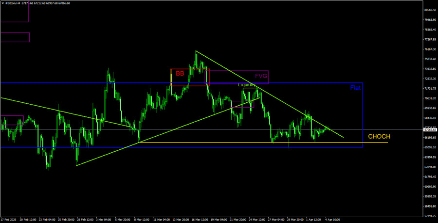 Ситуация на криптовалютном рынке остается прежней. На дневном ТФ это все та же вялая и слабая восходящая коррекция, на 4-часовом ТФ – это на 80% флэт с минимальным восходящим уклоном. В данное время чистый флэт отсутствует, но и трендовое движение тоже отсутствует даже на 4-часовом ТФ, что еще больше усложняет процесс торговли. Мы наблюдаем некий гибрид между крайне слабой восходящей тенденцией и флэтом. Последние движения больше всего похожи даже не на флэт, а на некий рэндом, схожий с тем, что мы наблюдаем на валютном рынке. Цену швыряет из стороны в сторону, трейдеры никак не могут определиться, что им делать дальше. К примеру, на 4-часовом ТФ биткоин находится сейчас около нижней границы бокового канала, что предполагает новый рост. Но флэт тоже не может длиться вечно. В то же время выше цены остается очевидный пул ликвидности выше линии тренда. В текущих обстоятельствах мы бы ожидали рост биткоина, но геополитика в воскресение-понедельник может спровоцировать новое падение. Тем временем, старший стратег Bloomberg Майк МакГлоун сообщил в интервью, что ужесточение взглядов ФРС на монетарную политику в 2026 году создает новые барьеры для биткоина. Напомним, что до событий на Ближнем Востоке ФРС планировала провести 2-3 снижения ключевой ставки в текущем году, а смягчение монетарной политики – это всегда хорошо для рисковых активов. Сейчас же многие центральные банки мира ожидают сильного ускорения инфляции, что не позволяет проводить снижение ставок, а также требует ужесточения. ФедРезерв на ужесточение политики пока не настроен, но некоторые эксперты считают, что и этот сценарий исключать нельзя.