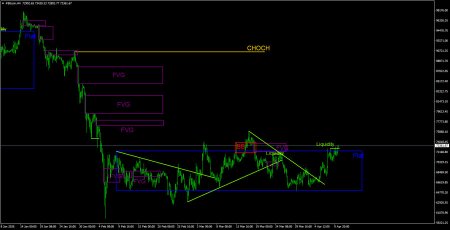 На дневном ТФ биткоин продолжает формирование нисходящей тенденции. Структура тренда идентифицируется, как нисходящая, а линия CHOCH остается на уровне 97 900$. Только выше этого уровня можно будет считать, что нисходящий тренд завершен. Так как признаков смены тренда на восходящий нет, мы считаем, что падение будет возобновлено. На дневном ТФ ближайшая область POI для новых сделок на продажу находится в диапазоне 79 500$ – 81 100$. Также следует следить за возможным снятием ликвидности с максимума от 17 марта, которое может стать предвестником нового падения. Пул ликвидности ниже линии тренда остается магнитом для цены.Общая картина BTC/USD на 4Н.