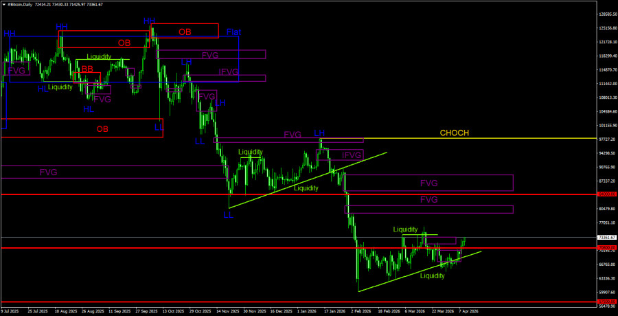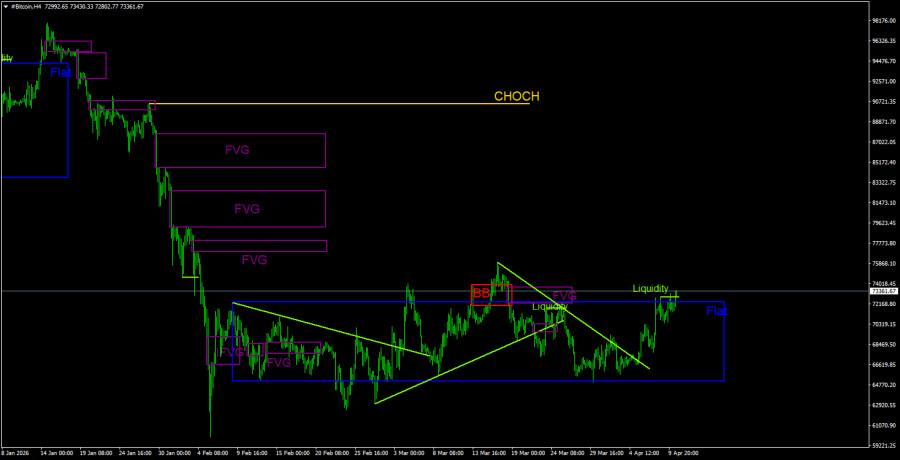 Ситуация на криптовалютном рынке остается прежнем. Биткоин уже два месяца корректируется в рамках шестимесячного нисходящего тренда, а в последние пять дней довольно активно растет предположительно на факторе геополитики. На этой неделе стало известно, что Тегеран и Вашингтон достигли договоренностей о двухнедельном перемирии, что должно было поддержать все рисковые активы и создать давление на доллар. В принципе, все именно так и произошло. Биткоин вырос на 6 000$, а доллар потерял против основных своих конкурентов порядка 200-300 пунктов. Однако на 4-часовом ТФ по-прежнему сохраняется флэт, а любое восходящее движение трактуется, как коррекция. Флэт может завершиться в ближайшее время, и в этом не будет ничего страшного. Биткоин может продолжить восходящую коррекцию на дневном ТФ, так как сверху у него остается минимум два незаполненных «медвежьих» FVG. Нисходящий тренд от таких движений не отменится. Биткоин торгуется внутри флэта уже 2 полных месяца. За это время Дональд Трамп успел подготовить весь мир к войне в Иране, 5 недель вместе с Израилем бомбить Иран, а затем установить перемирие, которое фактически уже было нарушено. Все это время биткоин продолжает торговаться в боковом канале. Таким образом, мы не считаем, что перемирие на Ближнем Востоке способно вернуть биткоин в восходящее русло. Возможно, мы увидим некоторый рост «цифрового золота» на этом факторе, но он в любом случае коррекционный. Таким образом, мы и дальше придерживаемся нашей точки зрения. На дневном ТФ отлично видно, что в данное время продолжается слабая восходящая коррекция, которая в любой момент может завершиться, так как длится она уже 2 месяца. Нисходящий тренд не завершен и нет ни одного признака начала восходящего тренда. Ликвидность ниже линии тренда не собрана, цель 57 500$ не отработана.