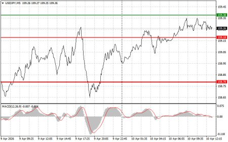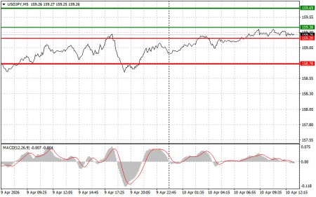 Сигнал на покупкуСценарий №1: покупать USD/JPY сегодня планирую при достижении точки входа в районе 159.38 (зеленая линия на графике) с целью роста к уровню 159.69 (более толстая зеленая линия на графике). В районе 159.69 буду выходить из покупок и открывать продажи в обратную сторону (расчет на движение в 30-35 пунктов в обратную сторону от уровня). Рассчитывать на рост пары сегодня получится при хорошей статистике. Важно! Перед покупкой убедитесь в том, что индикатор MACD находится выше нулевой отметки и только начинает свой рост от нее.Сценарий №2: покупать USD/JPY сегодня также планирую в случае двух подряд тестов цены 159.20 в момент, когда индикатор MACD будет находиться в области перепроданности. Это ограничит нисходящий потенциал пары и приведет к обратному развороту рынка вверх. Можно ожидать рост к противоположным уровням 159.38 и 159.69.Сигнал на продажу Сценарий №1: продавать USD/JPY сегодня планирую после обновления уровня 159.20 (красная линия на графике), что приведет к быстрому снижению пары. Ключевой целью продавцов будет уровень 158.78, где буду выходить из продаж, а также открывать сразу покупки в обратную сторону (расчет на движение в 20-25 пунктов в обратную сторону от уровня). Давление на пару сегодня может вернуться в любой момент. Важно! Перед продажей убедитесь в том, что индикатор MACD находится ниже нулевой отметки и только начинает свое снижение от нее. Сценарий №2: продавать USD/JPY сегодня также планирую в случае двух подряд тестов цены 159.38 в момент, когда индикатор MACD будет находиться в области перекупленности. Это ограничит восходящий потенциал пары и приведет к обратному развороту рынка вниз. Можно ожидать снижения к противоположному уровню 159.20 и 158.78.Что на графике:Тонкая зеленая линия – цена входа, по которой можно покупать торговый инструмент;Толстая зеленая линия – предположительная цена, где можно расставлять Take Profit или самостоятельно фиксировать прибыль, так как выше этого уровня дальнейший рост маловероятен;Тонкая красная линия – цена входа, по которой можно продавать торговый инструмент;Толстая красная линия – предположительная цена, где можно расставлять Take Profit или самостоятельно фиксировать прибыль, так как ниже этого уровня дальнейшее снижение маловероятно;Индикатор MACD. При входе в рынок важно руководствоваться зонами перекупленности и перепроданности.Важно. Начинающим трейдерам на рынке Форекс необходимо очень осторожно принимать решения по входу в рынок. Перед выходом важных фундаментальных отчетов лучше всего находиться вне рынка, чтобы избежать попадания в резкие колебания курса. Если вы решаетесь на торговлю во время выхода новостей, то всегда расставляйте стоп-приказы для минимизации убытков. Без расстановки стоп-приказов вы можете очень быстро потерять весь депозит, особенно если не используете мани-менеджмент, а торгуете большими объемами.И помните, что для успешной торговли необходимо иметь четкий торговый план, по примеру такого, который представлен мною выше. Спонтанное принятие торговых решений, исходя из текущей рыночной ситуации, является изначально проигрышной стратегией внутридневного трейдера.Материал предоставлен компанией InstaForex - www.instaforex.com