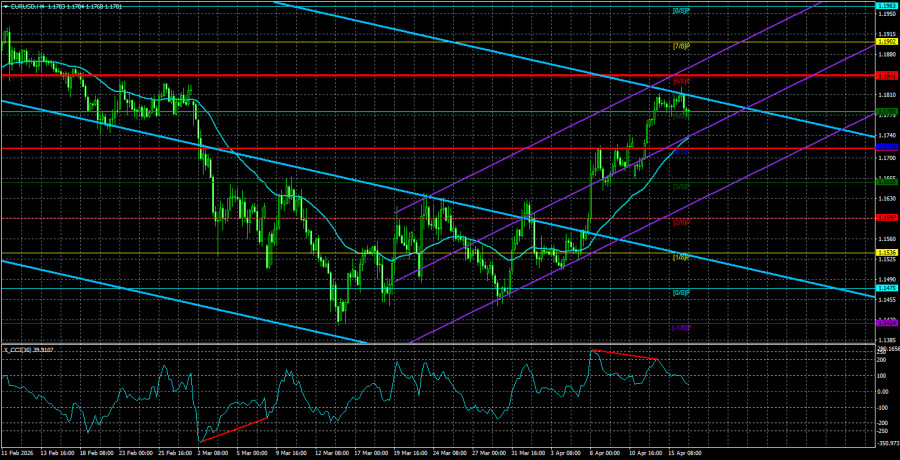 Валютная пара EUR/USD в течение четверга вновь торговалась с очень низкой волатильностью. Третий день подряд. С чем связана пауза на рынке? На наш взгляд, с отсутствием новостей. Макроэкономических, фундаментальных, геополитических. Макроэкономических отчетов на эту неделю изначально было запланировано крайне мало. У нас нет никакого недоумения по поводу отсутствия реакции рынка на второстепенные показатели промышленного производства или заявок на пособия по безработице. Из фундаментальных событий на этой неделе выделялись выступления Кристин Лагард, Эндрю Бейли, но рынок реагирует не на сам факт выступления председателя центрального банка, а на его заявления. Если важных заявлений сделано не было, то и реакции нет. Геополитический фактор ослабил свое влияние на валютный рынок, но все же именно геополитика остается ключевой. Поясним, что мы имеем ввиду. Трейдеры и инвесторы активно скупали американскую валюту больше месяца. Почему? Потому что ситуация на Ближнем Востоке превратилась из стабильной в ужасающую. Практически каждый день стороны конфликта наносили удары по объектам критической инфраструктуры, что провоцировало падение объемов добычи нефти и газа и, как следствие, дефицит энергоносителей на мировых рынках. Помимо этого, инвесторы начали бежать с Ближнего Востока, так как очень неприятно находится в Дубае, если над головой летают ракеты и дроны. Чуть позже Иран перекрыл Ормузский пролив, и ситуация с нефтью стала еще хуже. Именно на фоне всех этих событий доллар и рос практически каждый день. Также следует добавить к вышеперечисленному постоянную воинственную риторику Дональда Трампа, который неоднократно обещал уничтожить Иран и даже намекал на применение ядерного оружия. Что произошло две недели назад? Трамп неожиданно объявил о переговорах с Ираном, а также о двухнедельном перемирии. Хоть перемирие и было нарушено в первый же день, в последствии все стороны конфликта прекратили обстрелы и до сих пор режим тишины сохраняется. Ормузский пролив остается заблокированным, но от этого хуже ситуация с нефтью не стала. Более того, Вашингтон и Тегеран не отрицают возможность возобновления переговоров и достижения соглашения. Бонусом – Дональд Трамп теперь каждый день говорит о мире, сделке и завершении войны. Таким образом, негативных новостей нет, хоть ситуация на Ближнем Востоке и остается достаточно напряженной. Но все-таки участники конфликта встали на путь деэскалации и хотя бы прекратили уничтожение критически важной инфраструктуры в регионе. Поэтому доллар уже две недели не пользуется спросом. Все, кто бежали от рисков, уже убежали. А в последние две недели бежать не от чего, так как обстановка обещает наладиться в ближайшее время. Мы продолжаем считать, что февральские и мартовские события на Ближнем Востоке были в некотором роде подарком доллару. Когда он получит следующий такой подарок – неизвестно. Мы считаем, что тренды 2022 и 2025 годов будут возобновлены. Средняя волатильность валютной пары EUR/USD за последние 5 торговых дней по состоянию на 17 апреля составляет 63 пункта и характеризуется, как «средняя». Мы ожидаем движение пары между уровнями 1,1718 и 1,1844 в пятницу. Старший канал линейной регрессии развернулся вниз, что указывает на смену тренда на нисходящий. Однако фактически сейчас может возобновит