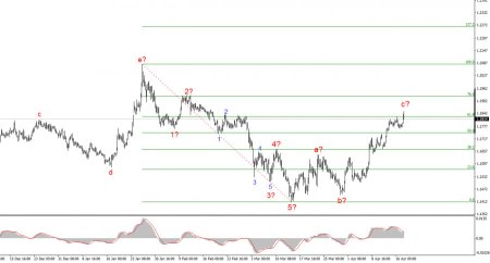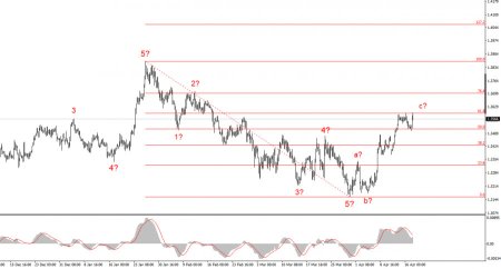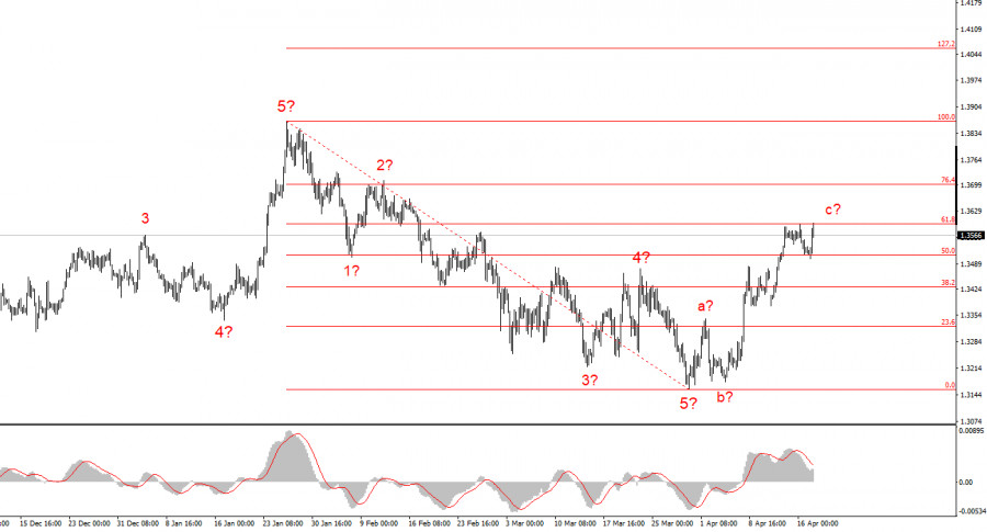 Волновая картина инструмента GBP/USD приобрела с течением времени более понятный вид, как я и предполагал. Теперь мы видим на графиках четкую пятиволновую понижательную структуру с удлинением в третьей волне. После этого инструмент построил коррекционный набор волн a-b-c, в рамках которого британец поднялся к отметке 1,3594, что соответствует 61,8% по Фибоначчи. Таким образом, этот участок тренда может быть завершен, а рынок уже учел перемирие и открытие Ормуза. Если будет достигнуто длительное перемирие, коррекционный участок тренда может превратиться в импульсный. Неудачная попытка прорыва отметки 1,3594 может вызвать отход котировок от достигнутых пиков и построение коррекционной волны.Основные принципы моего анализа: