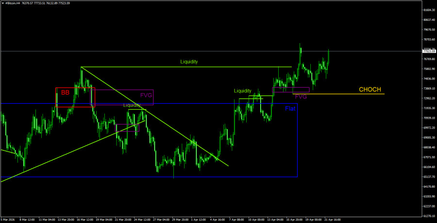 На 4-часовом таймфрейме цена продолжает формирование новой восходящей тенденции уже три недели. Характер движения криптовалюты остается максимально непривлекательным, но вполне обычным для коррекции. Дальнейший рост находится под вопросом, так как на дневном ТФ цена приближается к «медвежьему» FVG, около которого коррекция может быть завершена. Преодоление линии CHOCH укажет на слом текущей восходящей тенденции, что может стать отправной точкой для нисходящей тенденции, которая в свою очередь может стать началом нового витка тренда на дневном ТФ.Рекомендации по торговле BTC/USD: